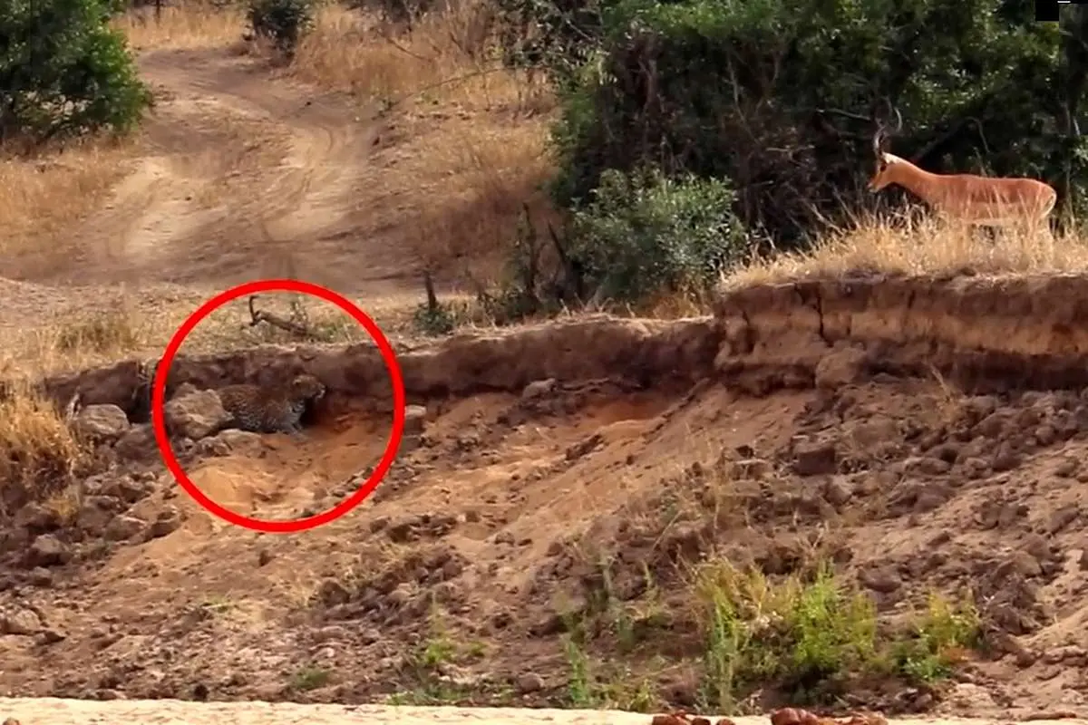ایمپالاها کاملاً بیخبر بودند از اینکه یک پلنگ با استفاده از پوشش طبیعی کرانه رودخانه در کمین آنها نشسته است. استتار پلنگ آنقدر خوب عمل کرد که یکی از ایمپالاها بدون آنکه متوجه خطری شود، درست از کنار او عبور کرد.