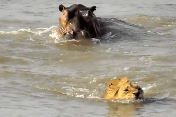 ببینید؛ اسب آبی خشمگین شیر نر را در رودخانه تعقیب کرد