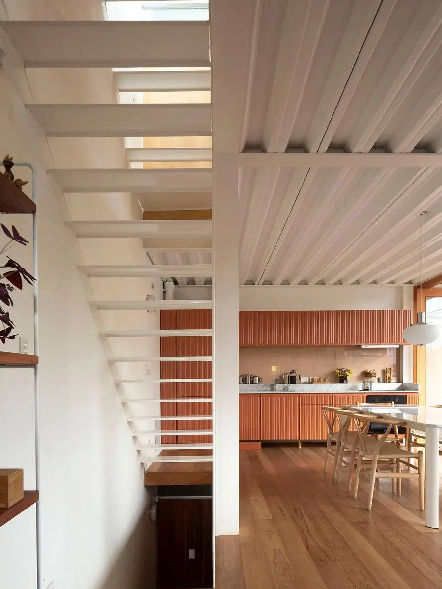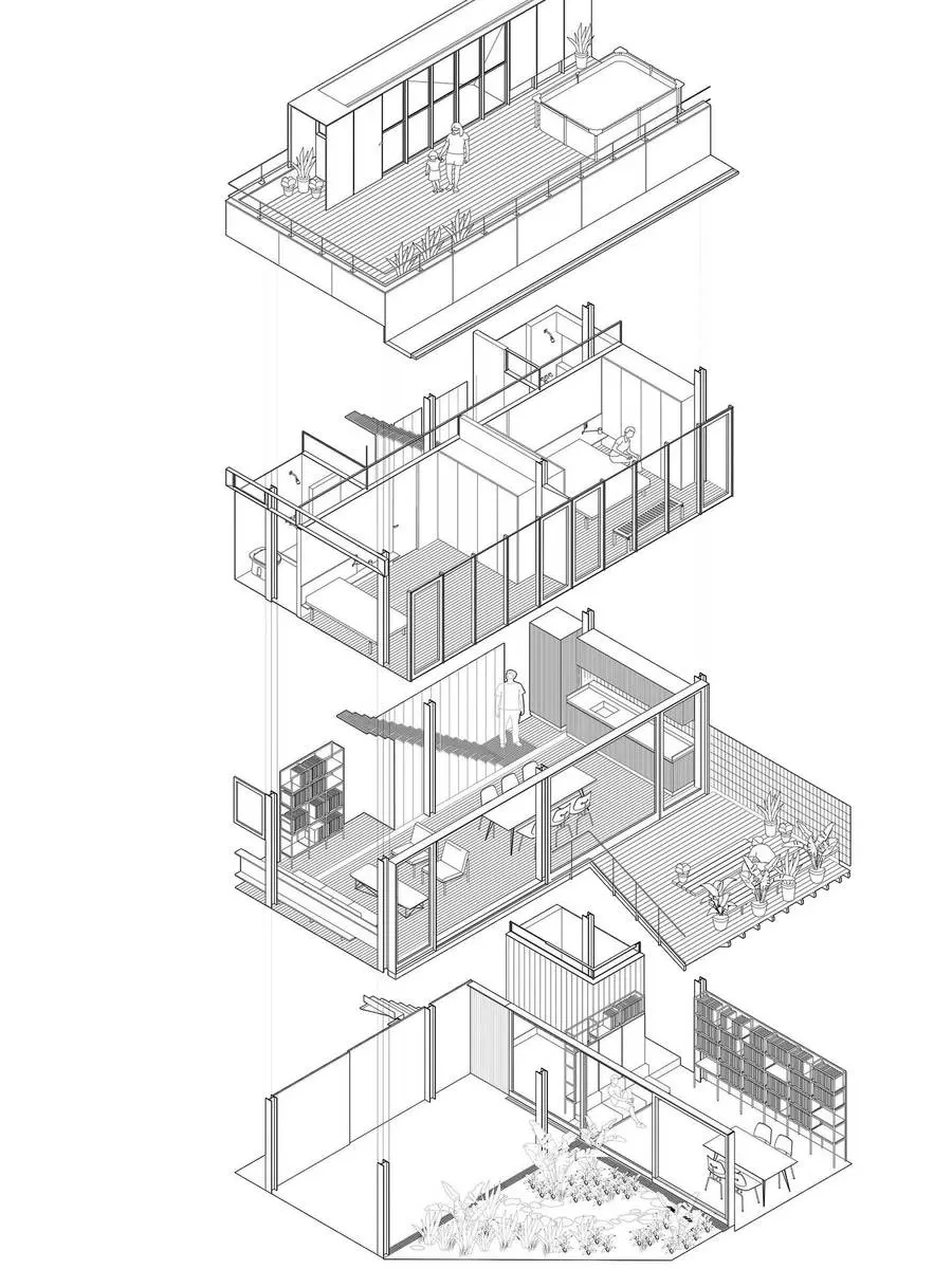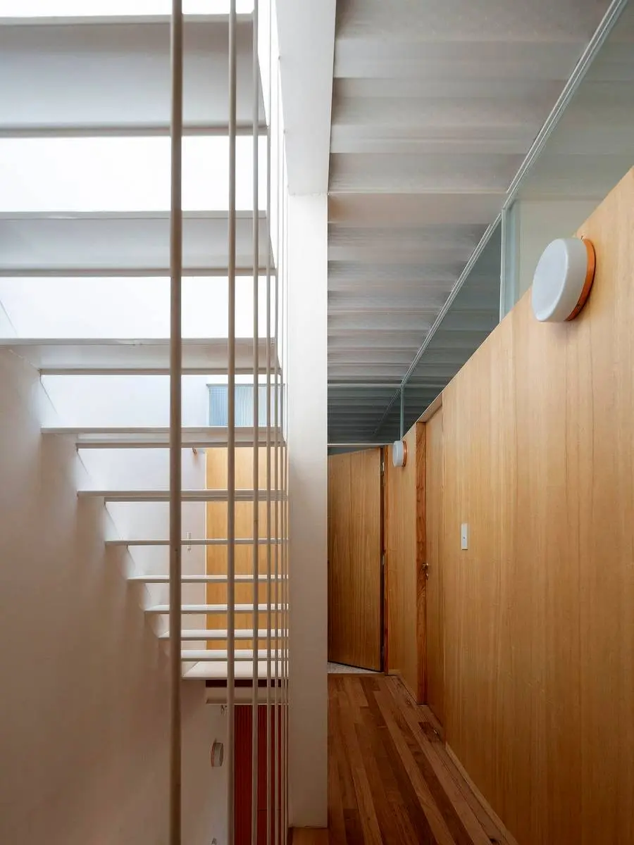 ساختار این خانه در سه طبقه طراحی و اجرا شده است و ستونها و عناصر اصلی آن، از پروفیل فولادی HEB 160 ساخته شدهاند. این پروفیل فولادی، عاملی است که تمامی تصمیمات سازهای را نظم بخشیده و سازماندهی میکند. جهتگیری پنجرهها به شکل هماهنگ و متناسب با انحنای ورقهای موجدار کف، اجرا شده است که ارتباطی بسیار منسجم و زیبا را در ساختار بنا به نمایش میگذارد.