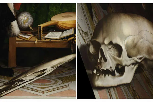 در نگاه اول، این نقاشی پرجزئیات از دو مرد در لباسهای مجلل دوران رنسانس تصویری رسمی و ایستا به نظر میرسد. اما اگر به پایین بوم و میان پاهای دو مرد نگاه کنید، لکهای نامعمول و کشیده از رنگ سفید و سیاه خواهید دید. با تغییر زاویه دید این لکه به تصویر یک جمجمه واضح تبدیل میشود.