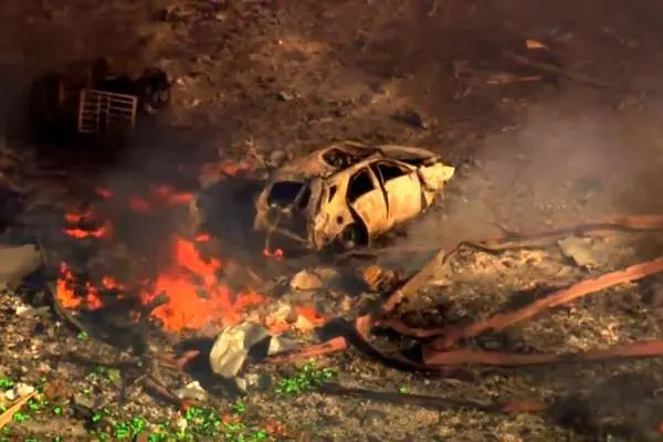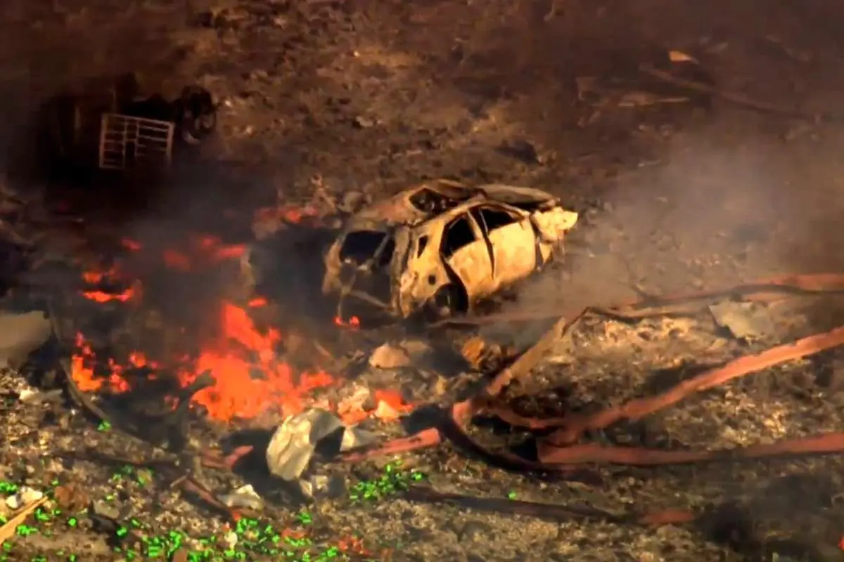 تصاویر هوایی، آوار گسترده، خودروهای به شدت آسیب دیده و ستونهای دود را نشان میدهد و محل حادثه به عنوان «تلفات کامل» توصیف شده است.