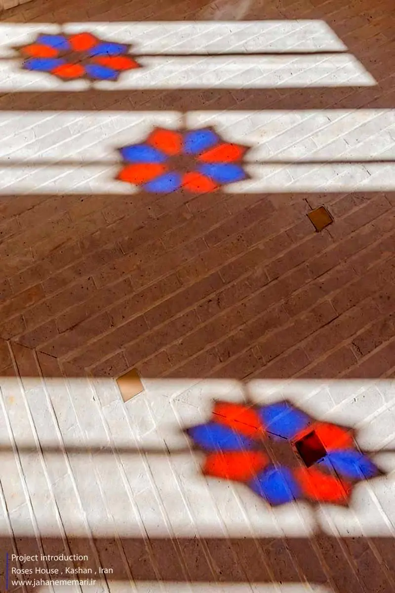 در ادامه حس ورود به کوچه های باریک کاشان بصورتی که با حرکت به سمت لابی دیوارهای جانبی با ایجاد ریتم متفاوت به صورتی که در ابتدای امر کاشی آبی رنگ بین آجرها از این زاویه خود نمایی و با حرکت به سمت جلو کاشیها از دید پنهان میشوند و به هنگام خروج بلعکس آن اتفاق میفتد، برای مخاطب ایجاد میشود. استفاده از آجرهای رنگ روشن به مینیمال بودن فضا کمک میکند. تمامی کف سازیهای هر قسمت بر اساس فلسفهای و بصورت دستی بریده ساخته و کف سازی شده است.