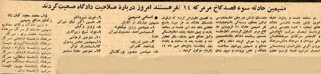به گزارش اطلاعات، ۱۴ نفر به جرم حضور در یک گروه چپ گرا که قصد ترور شاه را داشتند دستگیر شدند. روزنامه اطلاعات ۱۴ و ۱۵ مهر ۱۳۴۴ گزارشهای مصوری از دادگاه این گروه منتشر کرد. گزارشها را بخوانید و عکسها را تماشا کنید.