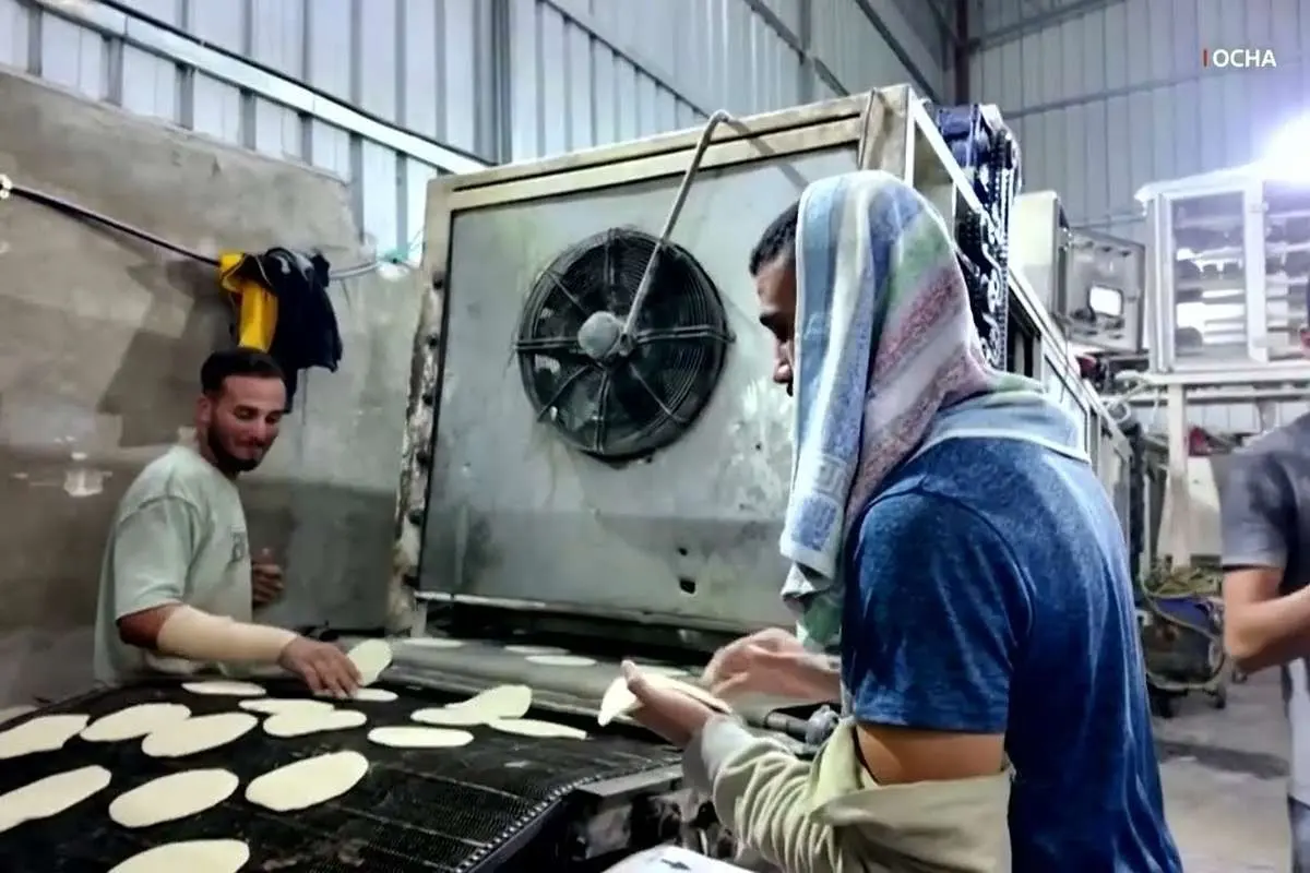 یک نانوایی در شهر دیرالبلح در نوار غزه دوباره فعالیت خود را از سر گرفته و روزانه حدود ۳۰۰ هزار قرص نان پیتا تولید میکند، پس از آنکه کمکهای بشردوستانه به این منطقه ویرانشده از بمباران رسید. تصاویر منتشرشده از سوی دفتر هماهنگی امور بشردوستانه سازمان ملل نشان میدهد که خط تولید نان در این نانوایی وابسته به برنامه جهانی غذا بهصورت پیوسته در حال کار است.