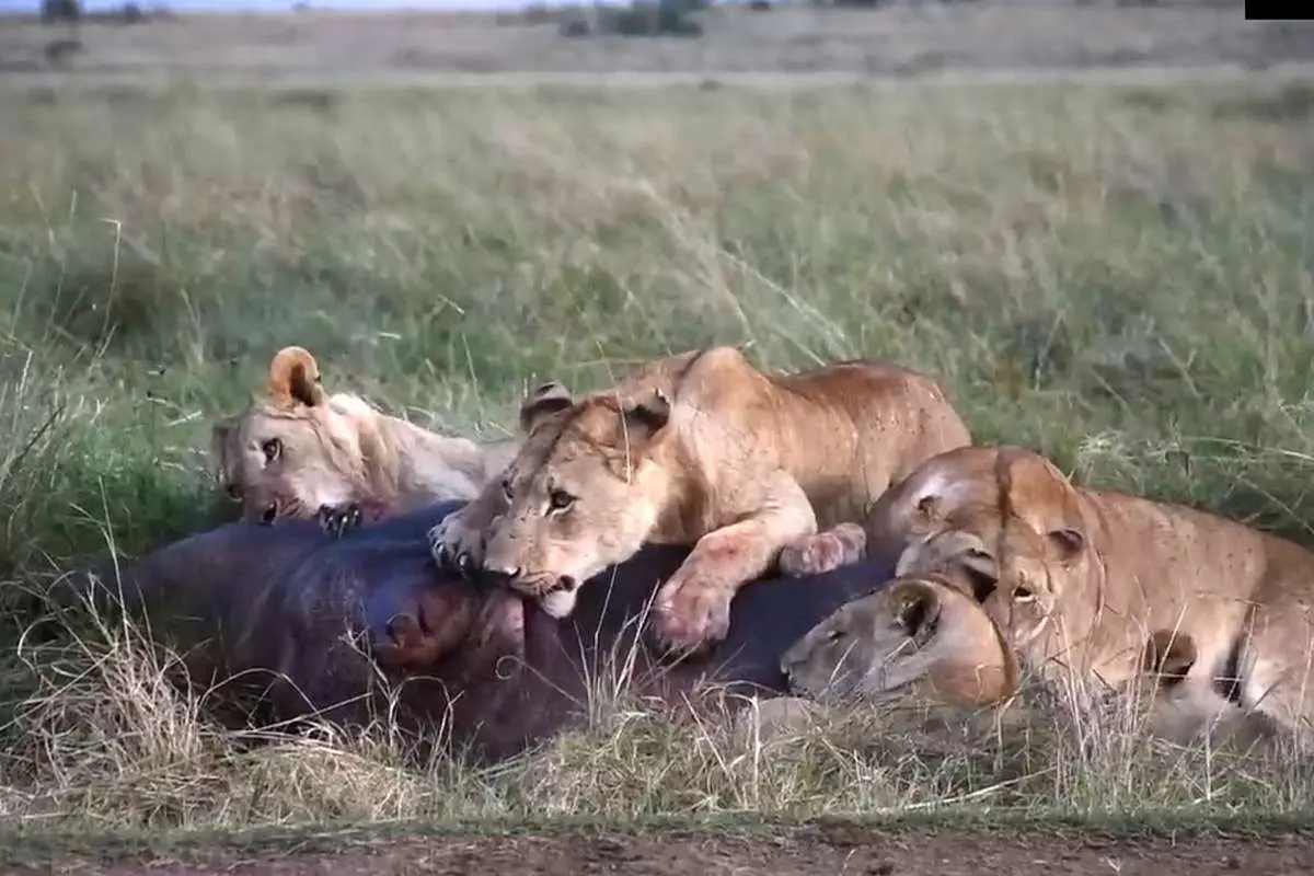 گروه شیرهای «پارادایس پراید» یک اسبآبی را که صبح هنگام دیر به سمت رودخانه بازمیگشت، شکار کردند. این صحنه در منطقه ماسای مارا توسط «الیشا کیمتای» فیلمبرداری شده است.