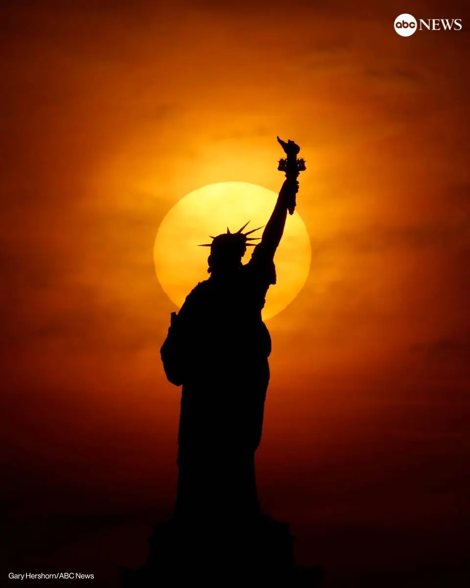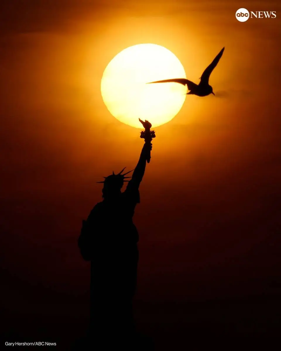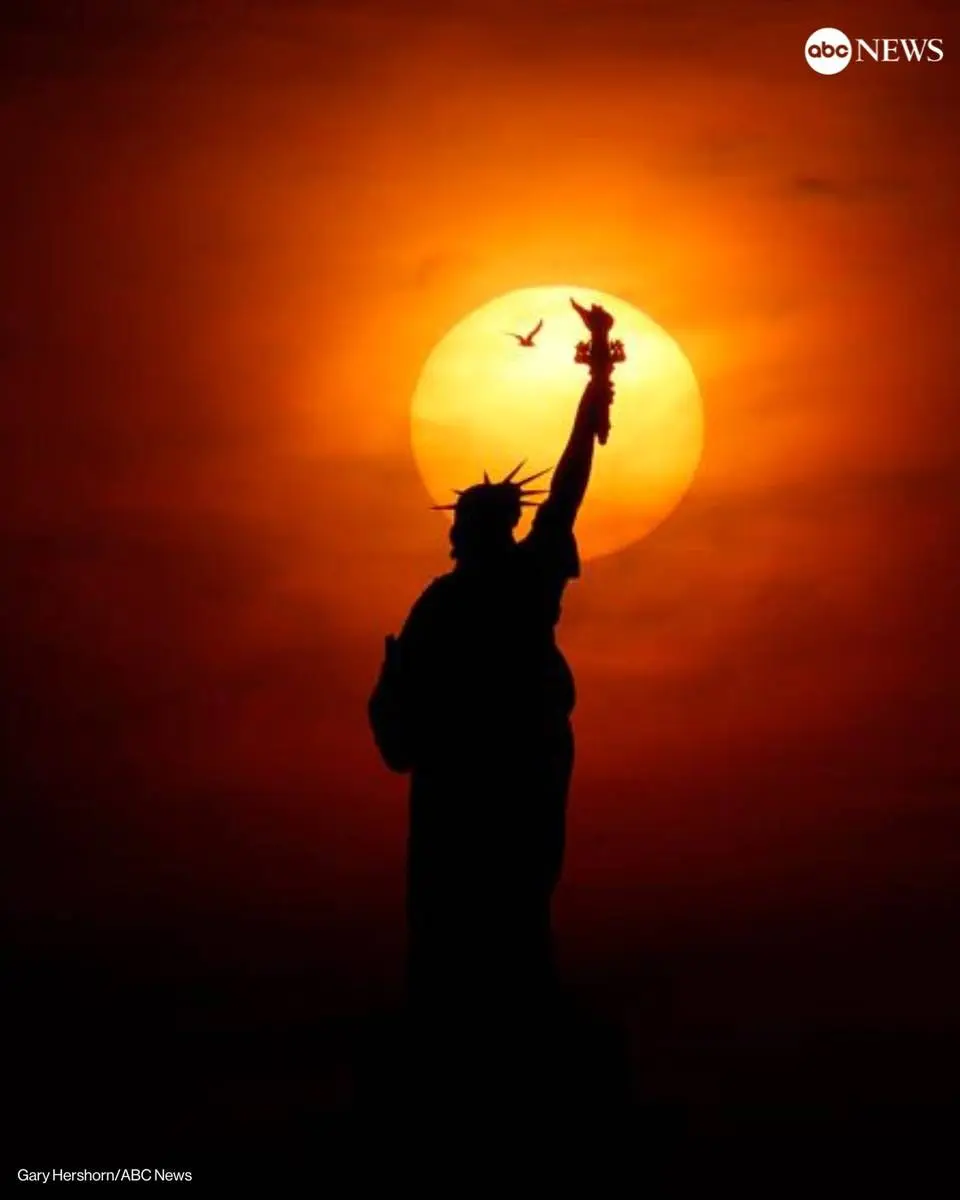 صبح یکشنبه، خورشید در پشت تندیس آزادی در شهر نیویورک طلوع کرد و منظرهای باشکوه و الهامبخش پدید آورد