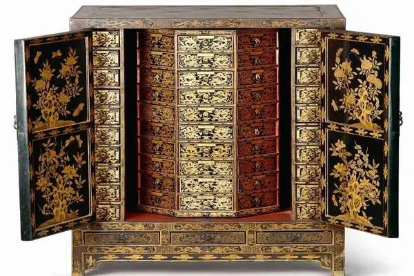 تزیینات این کابینت، نمایانگر اوج شکوه هنر لاک کاری درباری سلسله مینگ است.