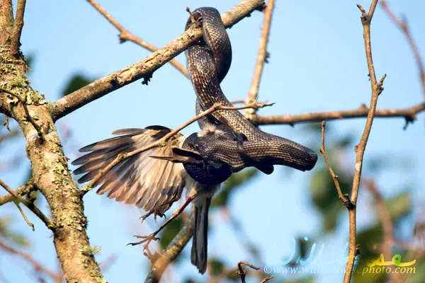 تصاویری از شکار یک پرنده مقلد توسط یک مار خاکستری منتشر شده است.