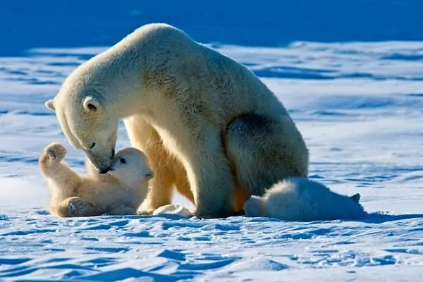 در تصاویر منتشرشده دیده میشود خرس مادر همچون یک یخشکن مسیر خود را در میان تودههای یخ باز میکند تا تولههایش بتوانند با آرامش در پی او شنا کنند