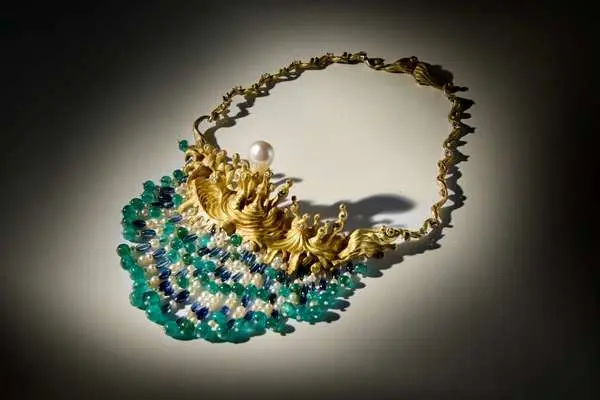 گردنبند موسوم به «دریای چرخان» (Swirling Sea Necklace) با الهام از حرکت امواج و صخرههای مرجانی طراحی شده است. ساختار اصلی آن از طلای ۱۸ عیار تشکیل شده که با الماسهای درخشان تزئین شده است. نتیجه، ترکیبی از جلوهای سلطنتی و تخیل سورئالیستی است؛ گویی طبیعت و رویا در هم تنیدهاند.