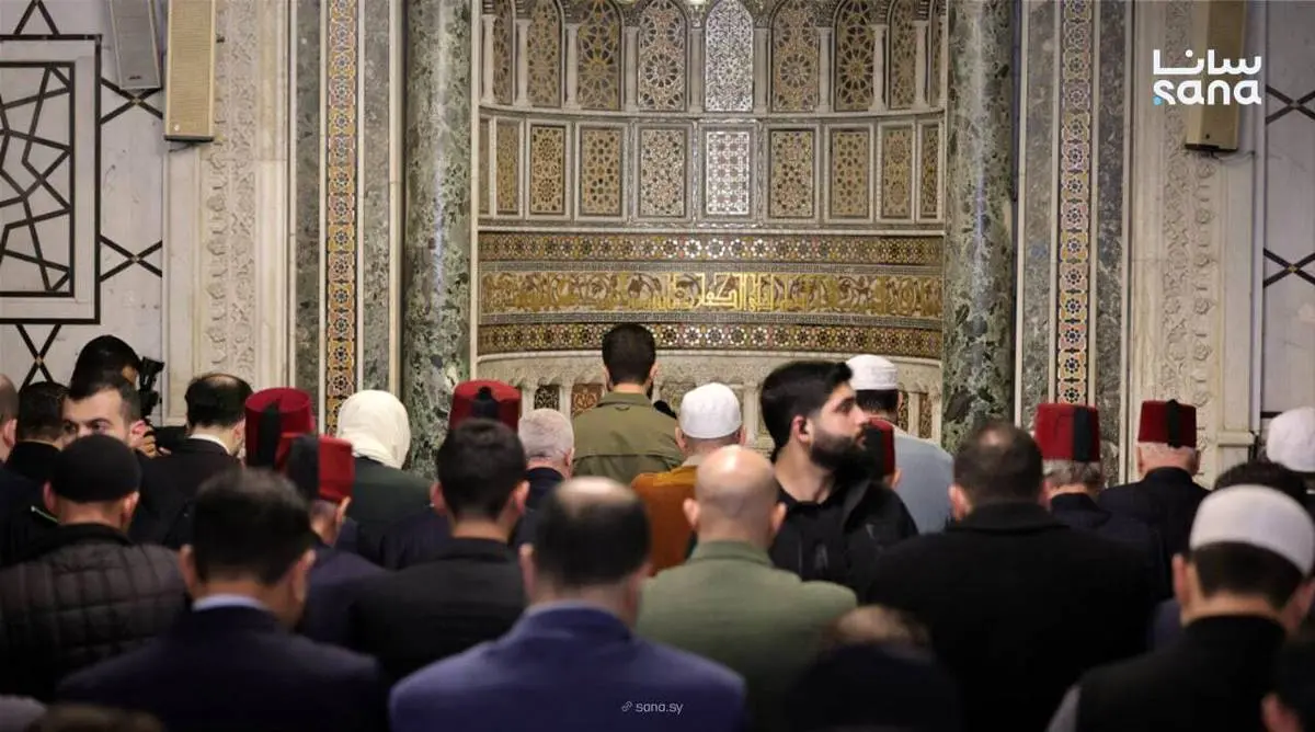 نماز صبح در مسجد امویین دمشق به امامت و سخنرانی احمد الشرع رئیس جمهوری موقت سوریه که یک سال قبل رهبری مخالفان مسلح در حمله به دمشق و سرنگونی حکومت بشار اسد را برعهده داشت